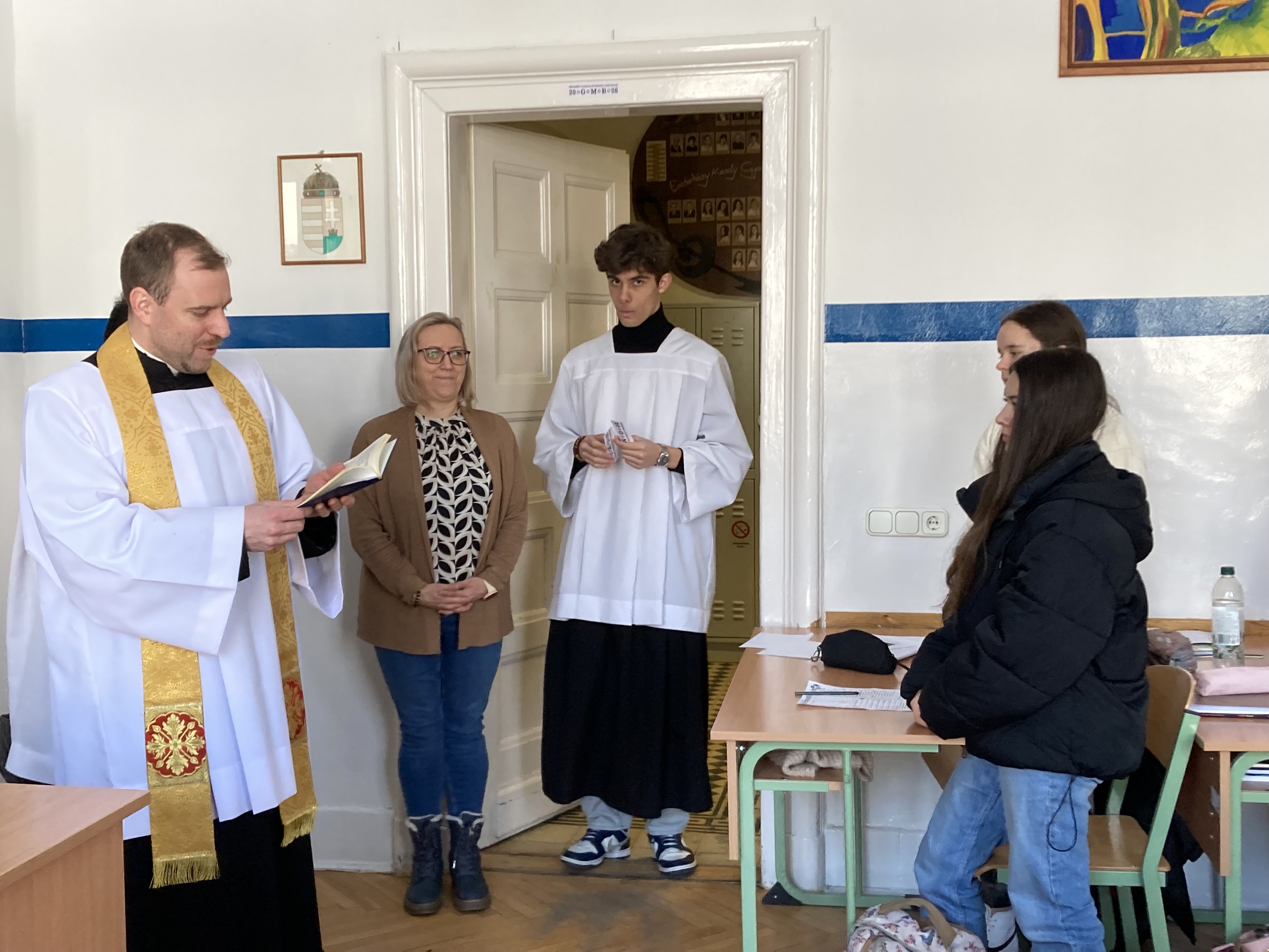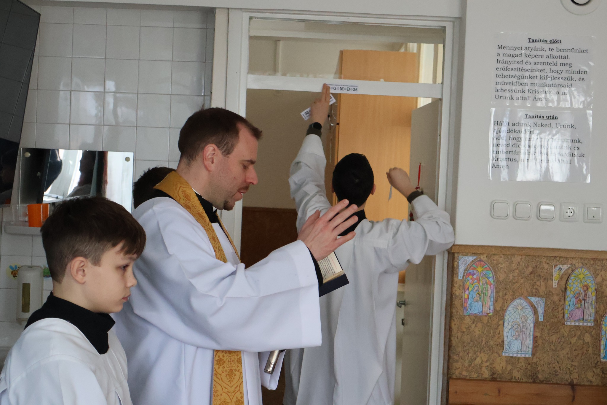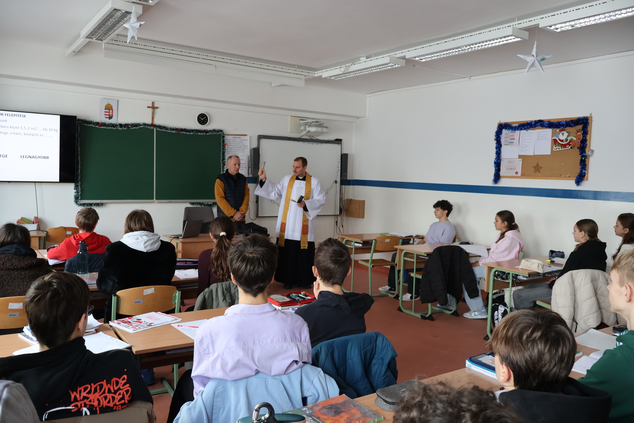 A szentmisén megszentelt vizet Gábor atya intézményünk mindkét épületébe elvitte, hogy az összes termet megszentelje, és az ott tartózkodókat megáldja. Bízunk abban, hogy a téli szünet meghitt élményeivel töltekezve, karácsony örömével és békességével a szívünkben Isten áldása kíséri majd a küzdelmesebb hétköznapjainkat is.